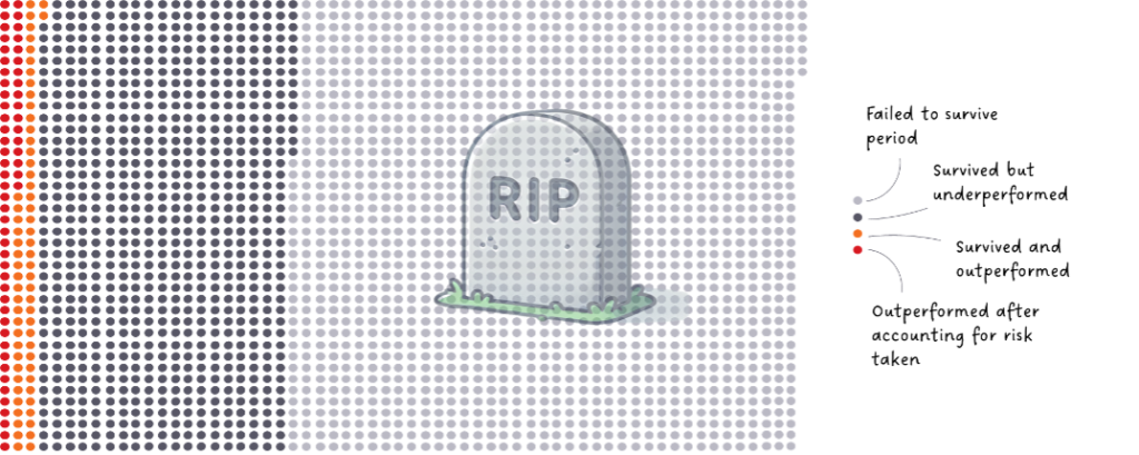 The graphic below demonstrates this hard truth. Over 20 years a majority of professionally managed active funds failed to survive. Of those that did survive only a minority (14%) beat the market, and of those only around half outperformed after accounting for the risk taken. These risk-adjusted outperformers account for just 2% of the starting sample of funds. Attempting to choose these funds in advance is an exceptionally difficult – perhaps impossible – task.